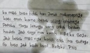 Siswi MTs di Sigi Minta Menu MBG Lebih Enak untuk Kado Ultah Ayah, Suratnya Viral Berita, Humaniora|16 Februari 202616 Februari 2026oleh Gayanara OUTENTIK-Sebuah surat yang ditulis Nur Rahmadani, siswi kelas VII MTs Biromaru, Kabupaten