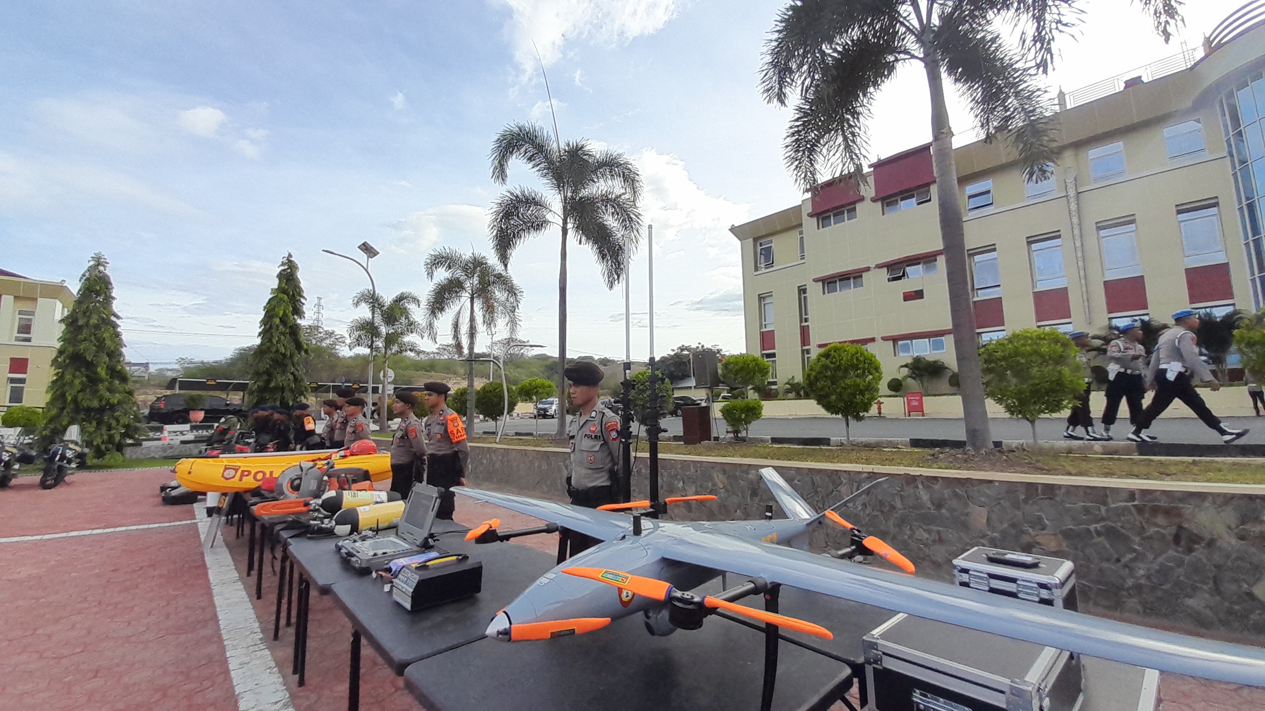 Drone unmanned aerial vehicle atau U-A-V jenis V-T-O-L yang merupakan bantuan Korps Sabhara Baharkam Polri tersebut terlihat di pamerkan pada apel gelar pasukan yang digelae oleh Poldq Sulteng, Jumat 20/12/2024.
