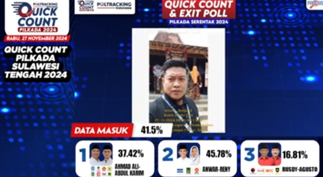Outentik-Pasangan calon Gubernur dan wakil Gubernur Sulteng nomor urut 2, Anwar Hafid- Reny Lamadjido memimpin suara sementara pada hasil perhitungan sementara atau Quick Count dari lembaga survey Poltracking Indonesia untuk Pilkada 2024 pemilihan Gubernur dan Wakil Gubernur Sulawesi Tengah.