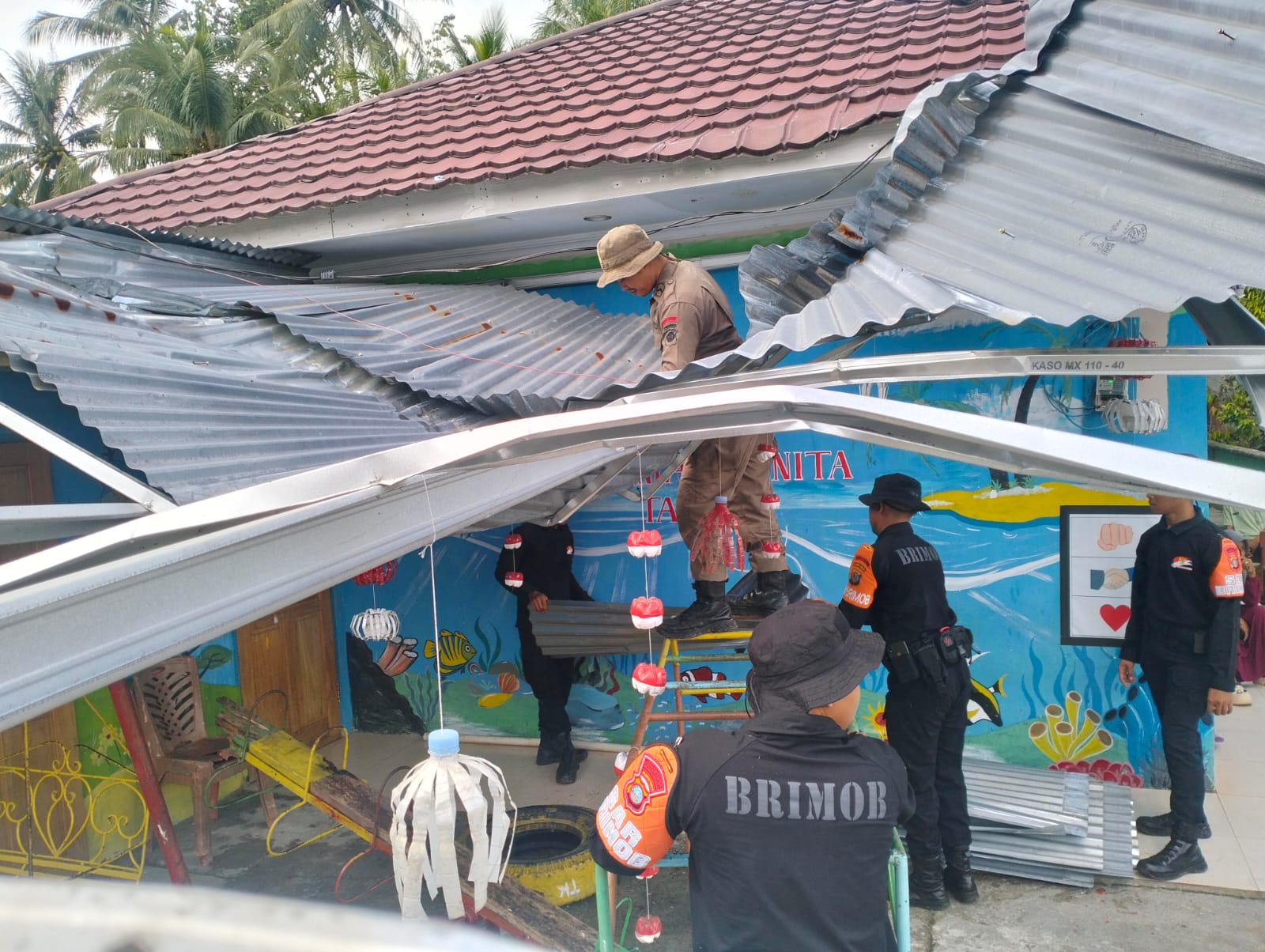 Satgas Madago Raya bersama personel Kompi 1 Batalyon B Pelopor Sat Brimob Polda Sulteng turun langsung membantu masyarakat yang terdampak puting beliung di Kelurahan Tabalu, Kecamatan Poso Pesisir, pada Minggu (6/4/2025).