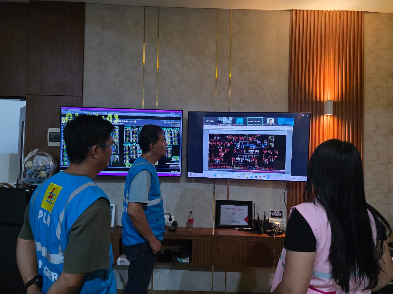 Manager PLN UP3 Palu Yanuar (Tengah) memonitor tegangan dan beban sistem Sulteng dan bersama tim mengikuti zoom kordinasi pemulihan kelistrikan Sulteng dan Sultra. Foto ; PLN UP3 Palu.