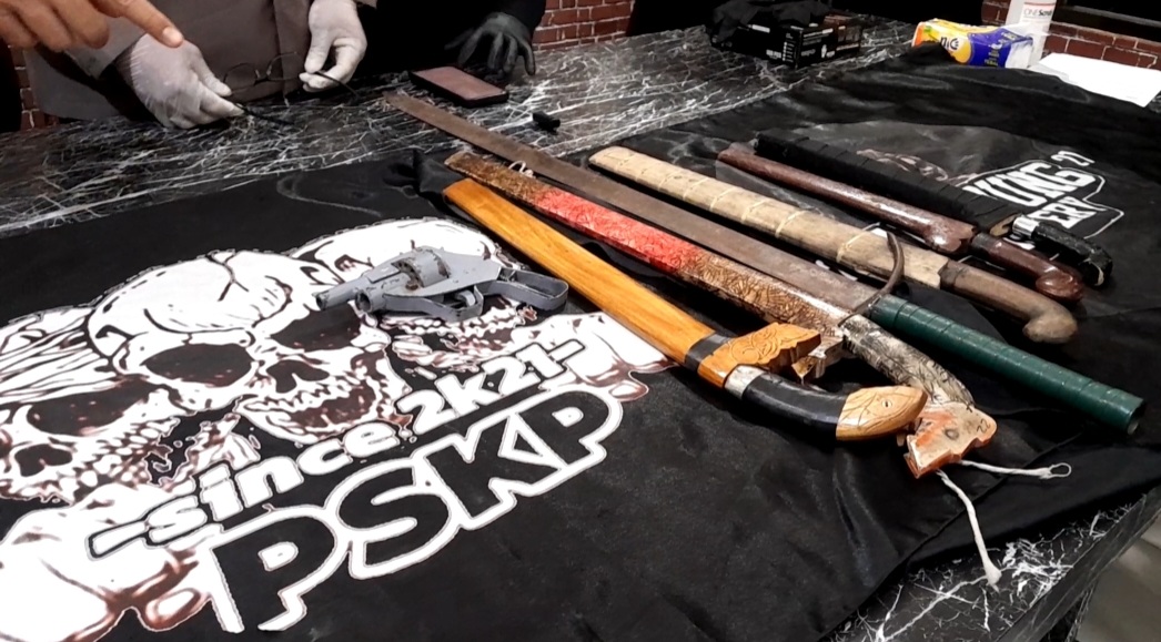 Dalam penangkapannya, polisi menemukan senjata tajam, satu pucuk senjata api rakitan, satu butir peluru, serta dua bendera yang diduga milik geng motor.
