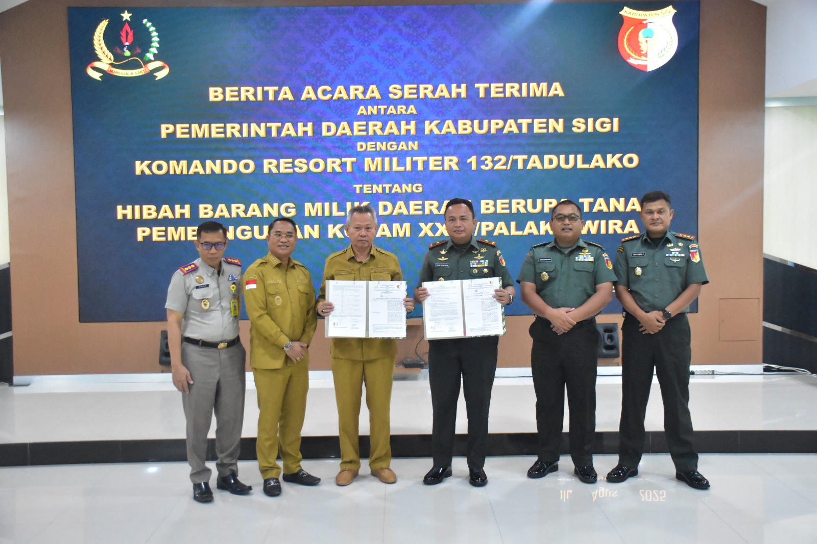 Acara diakhiri dengan penandatanganan berita acara serah terima dan penyerahan dokumen legalitas hibah tanah dari Pemda Sigi kepada Korem 132/Tadulako. Dengan hibah ini, proses pembentukan Kodam XXIII/Palaka Wira di Sulawesi Tengah dipastikan semakin siap terlaksana.