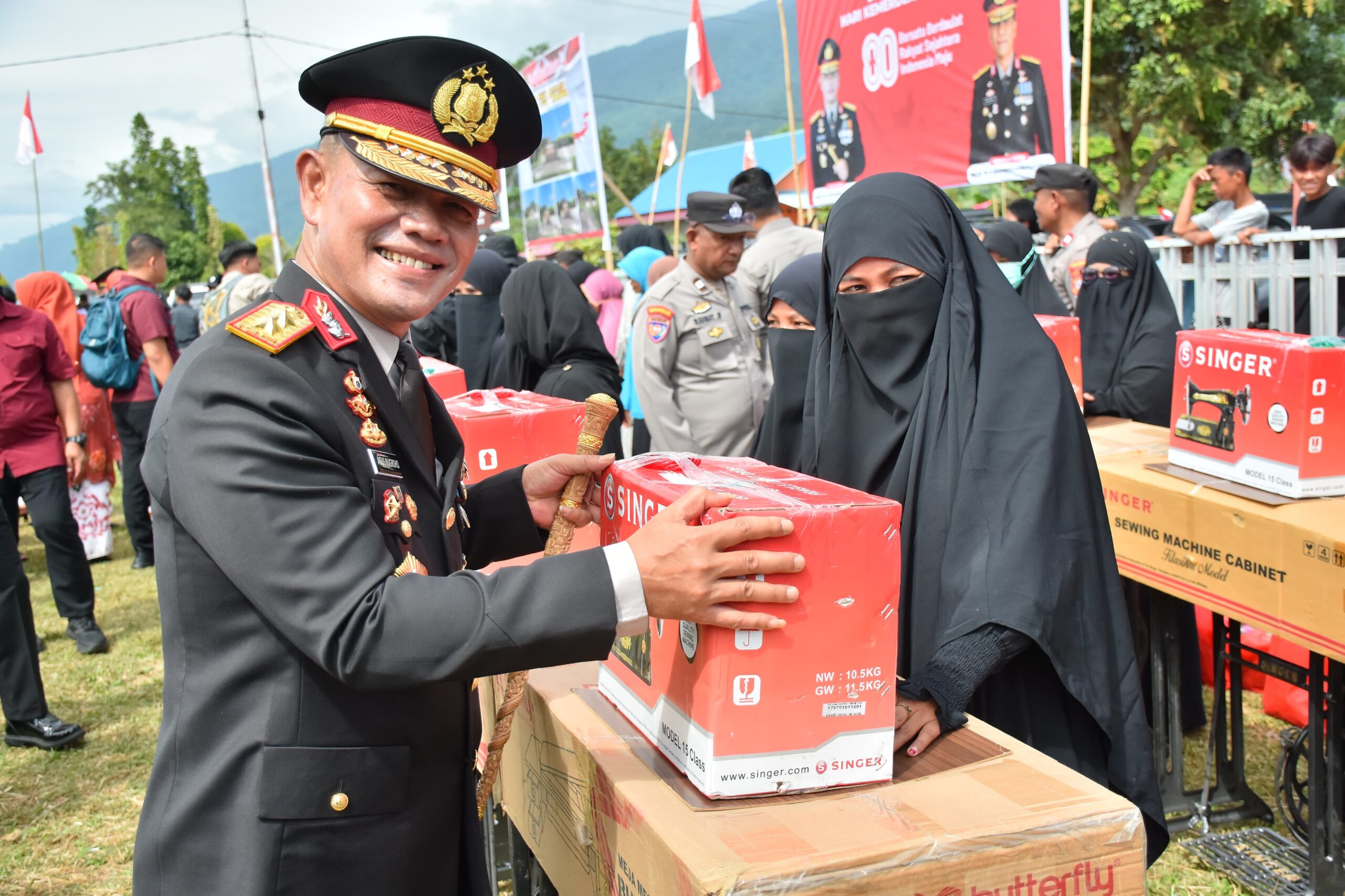 OUTENTIK-Kapolda Sulawesi Tengah Irjen Pol Dr. Agus Nugroho menyerahkan delapan unit mesin jahit kepada istri mantan eks napiter di Poso. Bantuan ini diberikan bersamaan dengan penyaluran 35 paket sembako untuk masyarakat sekitar.