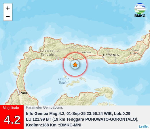 OUTENTIK-Gempa bumi dengan magnitudo 4,2 mengguncang wilayah Tenggara Pohuwato, Gorontalo, pada Senin (1/9/2025) pukul 23.56 WIB.