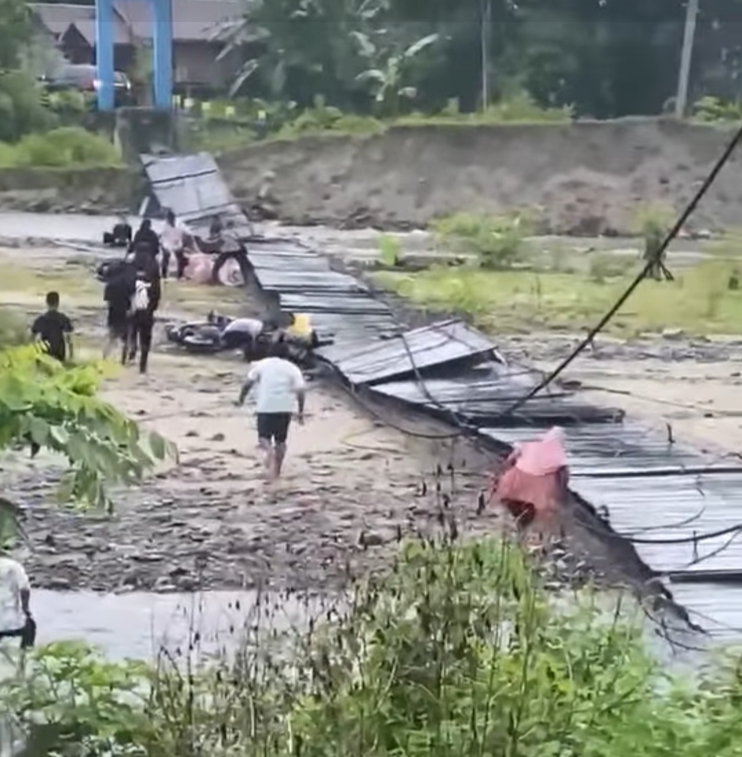 OUTENTIK-Jembatan gantung di Dusun Panyapu, Desa Galumpang, Kecamatan Dako Pemean, Kabupaten Tolitoli, ambruk saat dilintasi rombongan warga yang hendak menghadiri pesta pernikahan, Minggu (7/9/2025) sore.