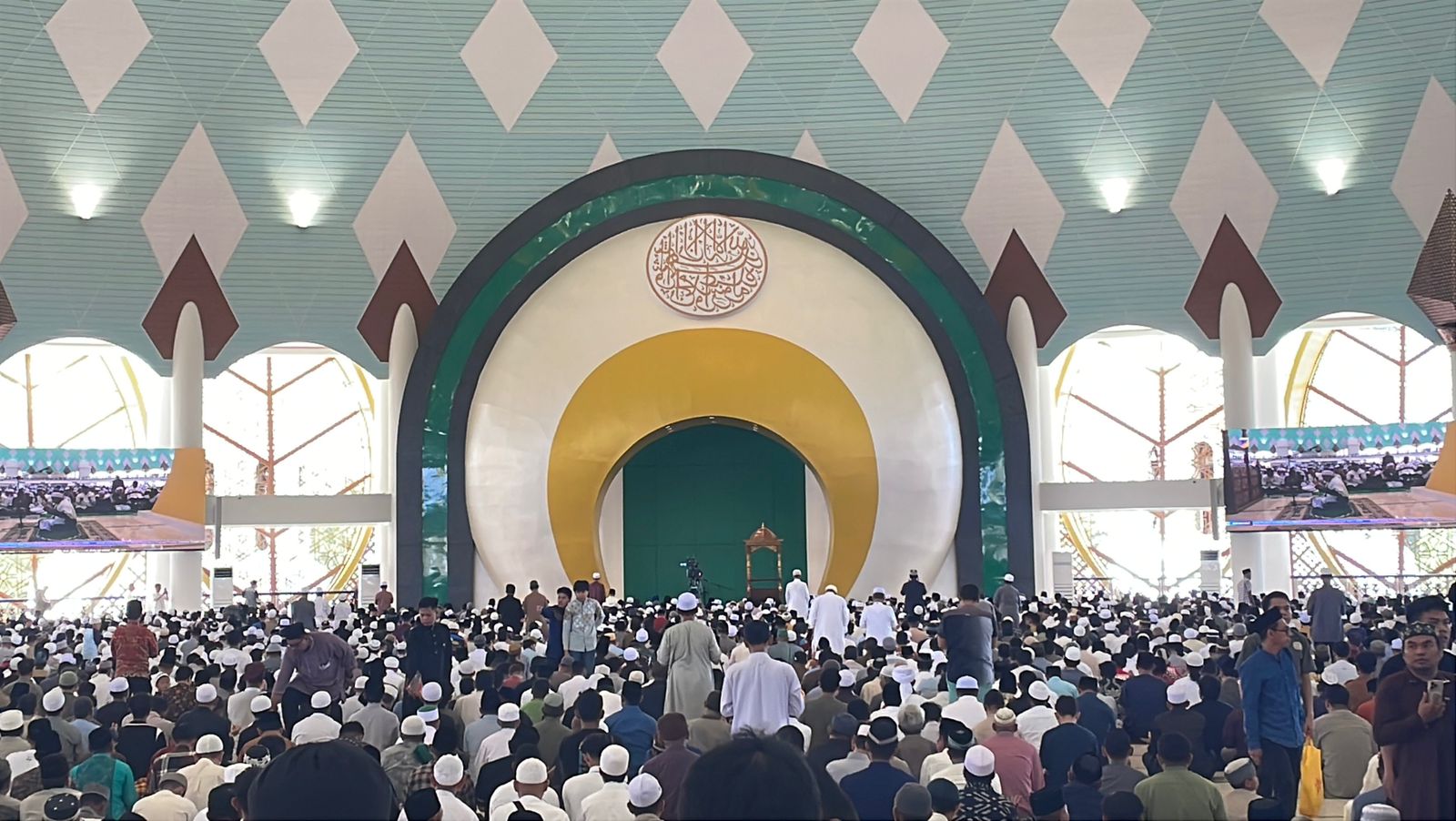 Arsitektur modern dan rancangan ruang terbuka memberikan kenyamanan meski jamaah membeludak. Prof. Dr. Lukman S. Tahir, M.A, Rektor UIN Datokarama Palu, bertindak sebagai khatib, sementara KH. Husen Habibu memimpin salat.