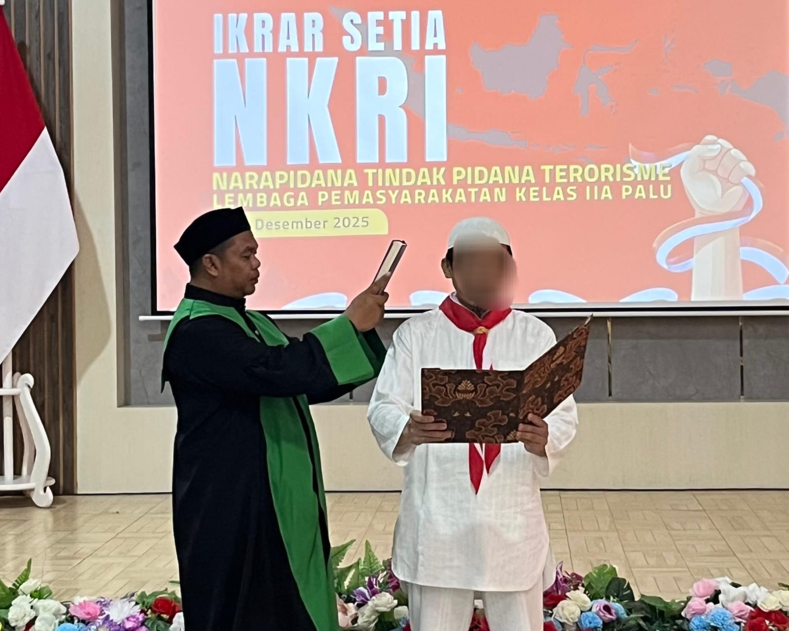 OUTENTIK-Seorang narapidana terorisme berinisial IHS di Lapas Kelas IIA Palu menyatakan ikrar setia kepada Negara Kesatuan Republik Indonesia (NKRI) pada Kamis, 4 Desember 2025.