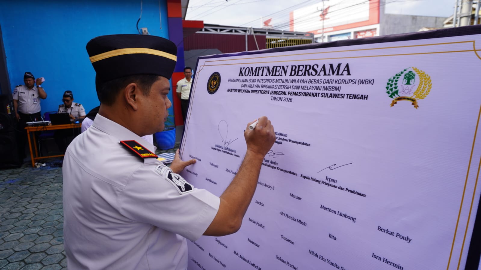 OUTENTIK-Kantor Wilayah Direktorat Jenderal Pemasyarakatan Sulawesi Tengah menegaskan komitmen penguatan integritas dan peningkatan kualitas pelayanan publik melalui penandatanganan komitmen bersama pembangunan Zona Integritas menuju Wilayah Bebas dari Korupsi (WBK) dan Wilayah Birokrasi Bersih dan Melayani (WBBM), yang dirangkaikan dengan peresmian ruang layanan dan galeri pemasyarakatan, Senin (2/2/2026), di Palu.